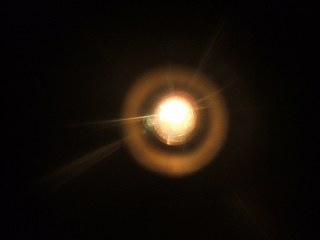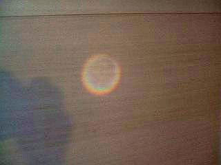 9月2日の朝のことです。東の空から昇ってきた朝日がうまい具合に玄関まで届いています。驚くことに、その光が玄関ドアの覗き窓を通して、反対の部屋のドアに焦点を結んでいました。このことに気がついたのは、横の部屋に住む娘です。その光路がちょうど、彼女の目の高さであったのも偶然です。