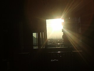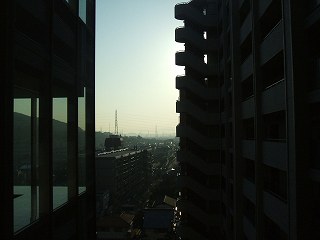 ![]() エレベーターホール(左)と建物(右)の隙間から朝日が入ってきます。 |