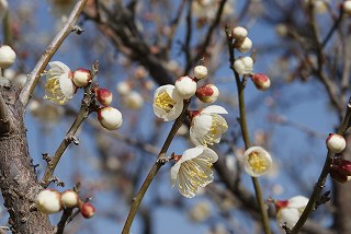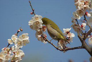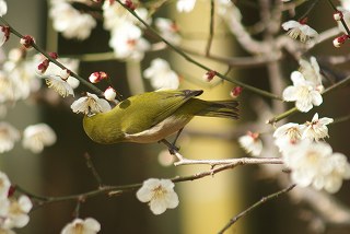 2月15日も行きましたが、ちょうど万博公園の梅まつりの期間中でした。春のような日差しの下、咲きはじめた梅の花がとてもきれいでした。メジロも梅の花を啄(ついば)んでいました。春遠からじ、といったところでしょうか。