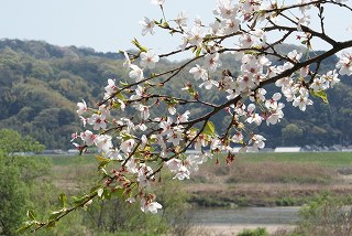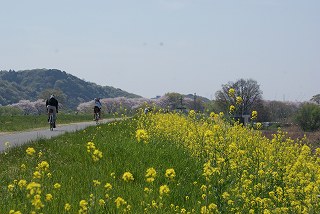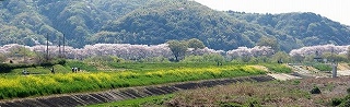 西洋カラシナと桜の対比がきれいです。間には川が流れています。