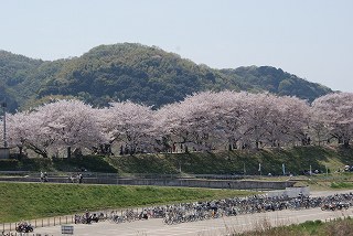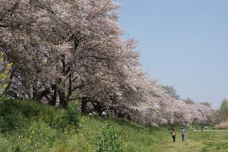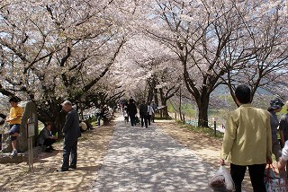 ![]() このような桜のトンネルが堤(土手)上に延びています。 |