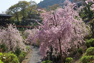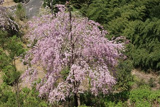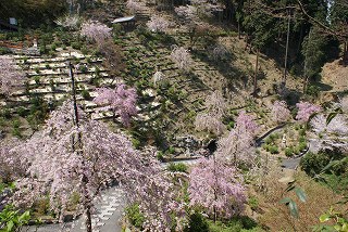 昨年、西国三十三ヵ所詣りで善峯寺に来たときに、たくさんの垂れ桜を見かけました。春にも訪れたいと思っていました。ここは山寺ですので里よりも少し春が遅いです。まさに山が桜色に染まっていました。なお、長岡京から車ではなく、高槻から西山古道という山道を歩いてきました。大沢(島本町)という集落から1時間くらいで着きました。はるか遠くに京都、宇治方面がよく見えます。