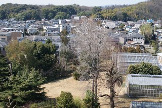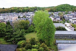 眼下の京大の実験温室の大きな木は、新緑のまぶしい葉に覆われはじめました。秋には紅葉します。季節の移ろいを感じます。 (四季の変化は写真館の中にもあります)