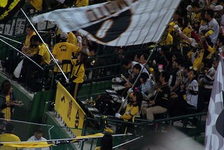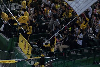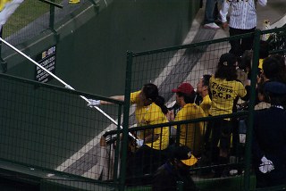 ![]() ライト応援団の最前線で旗を振るおばちゃん。 |