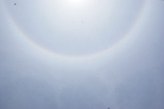 6月27日に神戸王子スタジアムで高校アメフトの府県選抜の対抗戦(プリンスボウル)があり、ゲームを見に行ってきました。梅雨なのに日ざしが強く、まるで夏のようでした。ふと空を見上げると太陽のまわりに暈がかかっていました。私はあまり馴染みはありませんが日輪とも呼ぶようです。たぶん、この現象はよく起こっていると思います。まぶしい空を見上げて太陽を屋根で隠しながら写真を撮りました。
