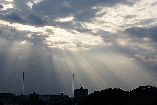 下記の写真は、雲の切れ間から太陽の光が差し込んでいるところで、太陽の光が水蒸気などで散乱しているため、このような光の筋が見えます。これはよく目にする光景ですが、西洋では「天使の階段」と呼ばれています。