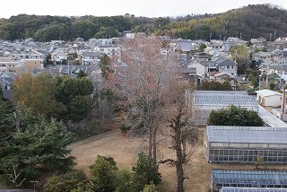 さて、我が家のバルコニーから見る風景ですが、紅葉を観察していた京都大学の実験温室敷地内の木もすっかり冬枯れしました。春を待っています。若葉がまぶしい春が楽しみです。